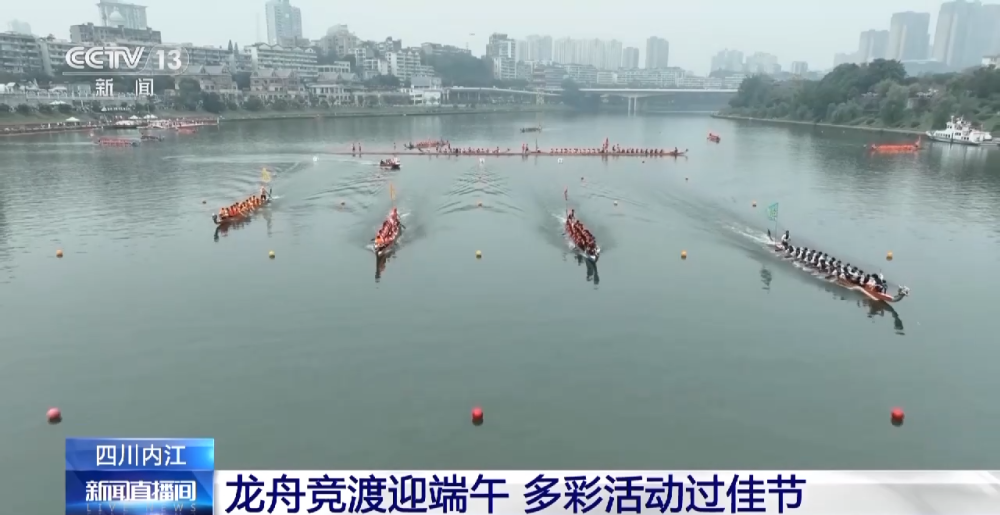 總臺記者 趙雄:我現(xiàn)在是在四川內(nèi)江市的沱江河畔,我身后的水面上進行的是今年端午節(jié)的劃龍舟比賽。在現(xiàn)場我們可以看到,水手正在根據(jù)鑼鼓聲的節(jié)奏,快速地搶劃船槳,四艘并排的龍舟快速地沖向終點。今年的龍舟比賽共分為四組,實行一輪定勝負,按時間進行最終排名。