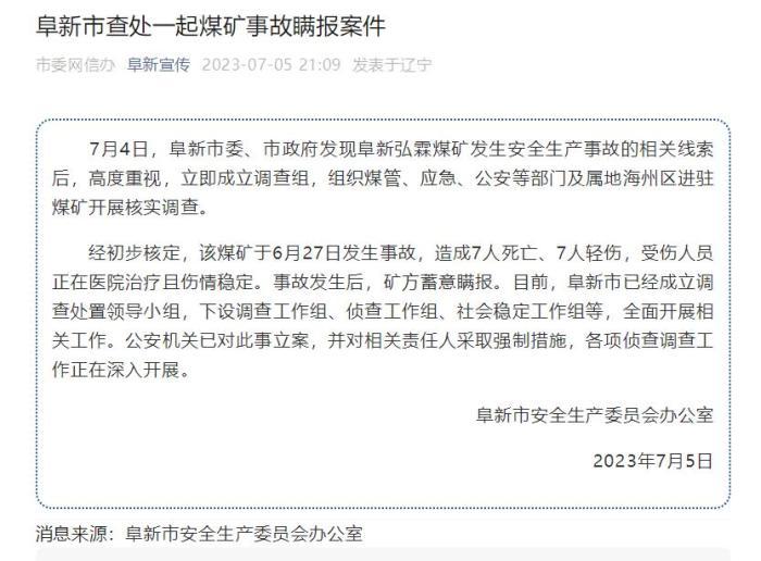 經(jīng)初步核定,該煤礦于6月27日發(fā)生事故,造成7人死亡、7人輕傷,受傷人員正在醫(yī)院治療且傷情穩(wěn)定。事故發(fā)生后,礦方蓄意瞞報。