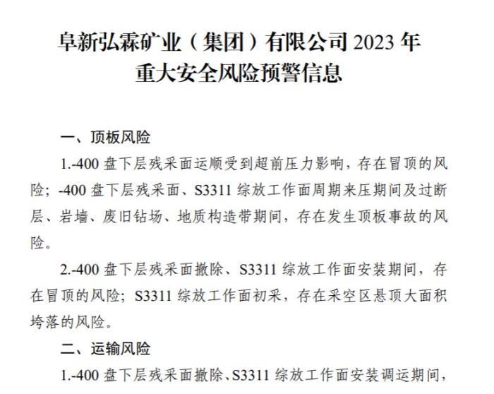 2021年2月,阜新市煤炭工業(yè)轉(zhuǎn)型發(fā)展局、遼寧煤監(jiān)局遼西監(jiān)察分局就曾發(fā)布2021年平安煤礦和弘霖煤礦重大安全風(fēng)險預(yù)警信息,重大安全風(fēng)險預(yù)判清單顯示,弘霖煤礦存在“超強(qiáng)度、超定員組織生產(chǎn)風(fēng)險”“安全監(jiān)測監(jiān)控系統(tǒng)出現(xiàn)故障”等問題。
