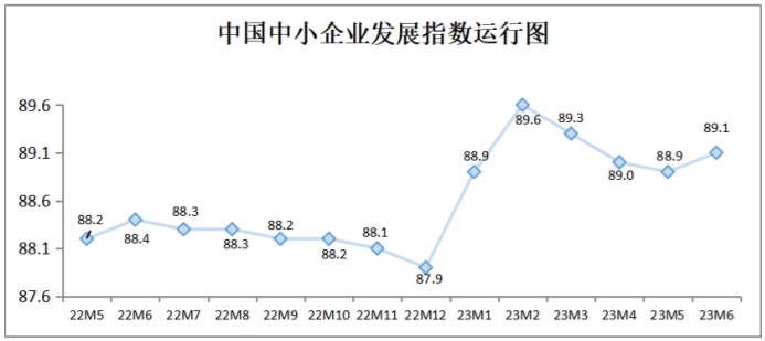 中國中小企業(yè)協(xié)會今天(10日)發(fā)布,隨著推動經(jīng)濟回暖向好的政策措施持續(xù)發(fā)力生效,我國經(jīng)濟總體保持恢復態(tài)勢,中小企業(yè)發(fā)展指數(shù)止跌回升。6月中國中小企業(yè)發(fā)展指數(shù)(SMEDI)為89.1,比上月上升0.2點,結(jié)束連續(xù)3個月下降態(tài)勢,且高于2022年同期水平。