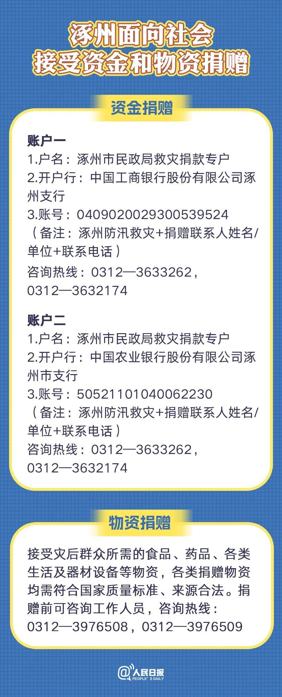 8月3日,涿州市發(fā)布《涿州市防汛抗旱指揮部關(guān)于接受社會捐贈的公告》。受強臺風(fēng)“杜蘇芮”影響,近日涿州市遭受洪水災(zāi)害,受災(zāi)嚴(yán)重,給人民群眾生命財產(chǎn)帶來重大損失。為助力涿州市防汛救災(zāi),及時保障災(zāi)區(qū)群眾的生活需要,現(xiàn)將接受救災(zāi)捐贈事項公告如下: