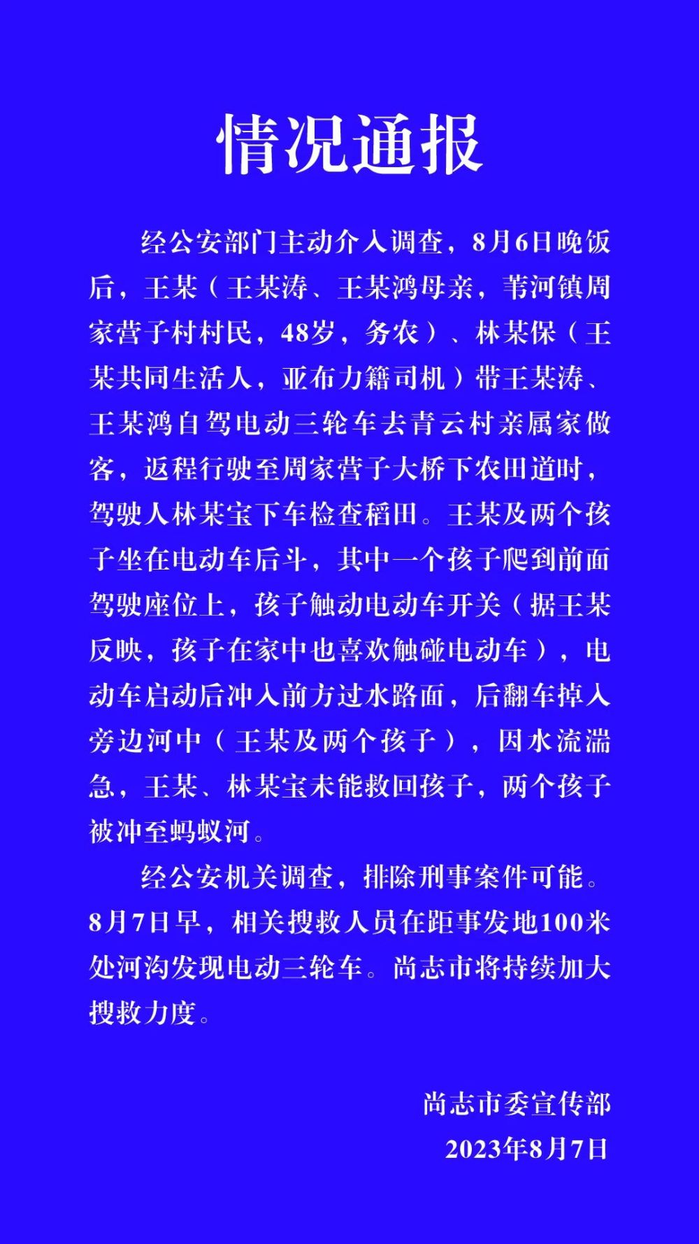 中新網(wǎng)8月8日電 據(jù)尚志市委宣傳部微信公眾號(hào)消息,經(jīng)公安部門(mén)主動(dòng)介入調(diào)查,8月6日晚飯后,王某(王某濤、王某鴻母親,葦河鎮(zhèn)周家營(yíng)子村村民,48歲,務(wù)農(nóng))、林某保(王某共同生活人,亞布力籍司機(jī))帶王某濤、王某鴻自駕電動(dòng)三輪車(chē)去青云村親屬家做客,返程行駛至周家營(yíng)子大橋下農(nóng)田道時(shí),駕駛?cè)肆帜硨毾萝?chē)檢查稻田。王某及兩個(gè)孩子坐在電動(dòng)車(chē)后斗,其中一個(gè)孩子爬到前面駕駛座位上,孩子觸動(dòng)電動(dòng)車(chē)開(kāi)關(guān)(據(jù)王某反映,孩子在家中也喜歡觸碰電動(dòng)車(chē)),電動(dòng)車(chē)啟動(dòng)后沖入前方過(guò)水路面,后翻車(chē)掉入旁邊河中(王某及兩個(gè)孩子),因水流湍急,王某、林某寶未能救回孩子,兩個(gè)孩子被沖至螞蟻河。