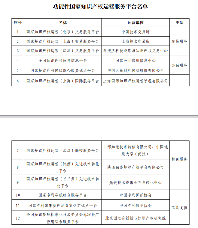 國(guó)家知識(shí)產(chǎn)權(quán)局認(rèn)定12家功能性國(guó)家知識(shí)產(chǎn)權(quán)運(yùn)營(yíng)服務(wù)平臺(tái)