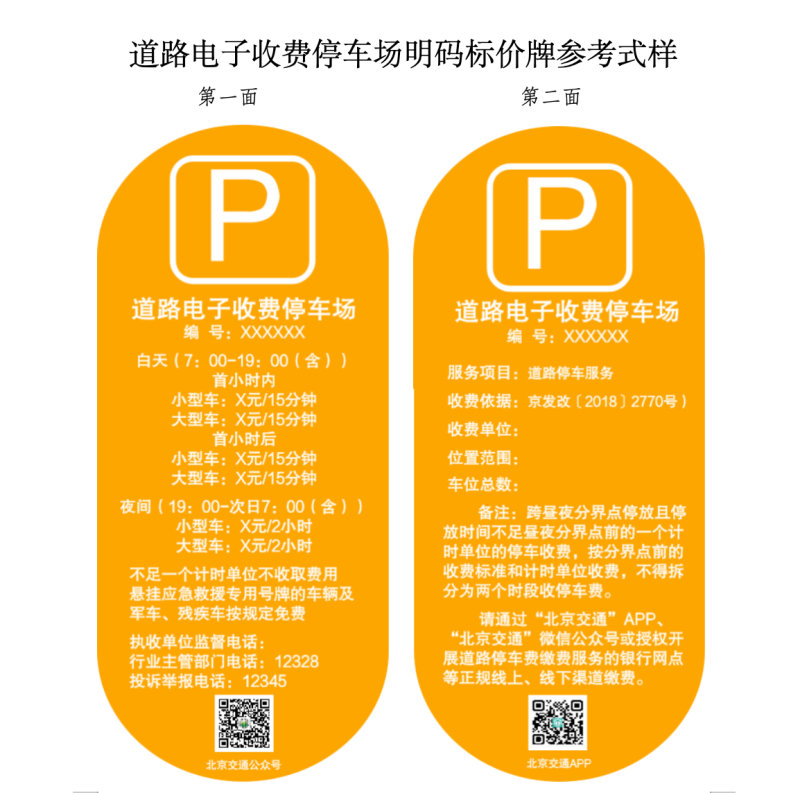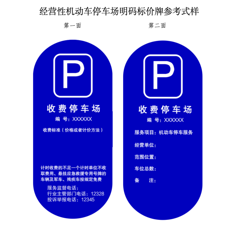 根據(jù)相關(guān)法規(guī)政策的新要求,按照依法合規(guī)、便民利民、不做大改的原則,征求意見(jiàn)稿對(duì)兩種機(jī)動(dòng)車(chē)停車(chē)場(chǎng)明碼標(biāo)價(jià)牌參考式樣進(jìn)行了修改完善,并附上“經(jīng)營(yíng)性機(jī)動(dòng)車(chē)停車(chē)場(chǎng)明碼標(biāo)價(jià)牌參考式樣”和“道路電子收費(fèi)停車(chē)場(chǎng)明碼標(biāo)價(jià)牌參考式樣”,供相關(guān)單位參照自行制作明碼標(biāo)價(jià)牌,明碼標(biāo)價(jià)牌編號(hào)為北京市公共停車(chē)場(chǎng)經(jīng)營(yíng)備案證的備案號(hào)。