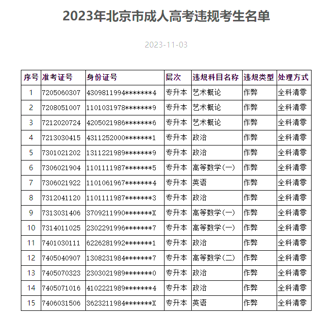 15人作弊 2023年北京市成人高考違規(guī)考生名單公布