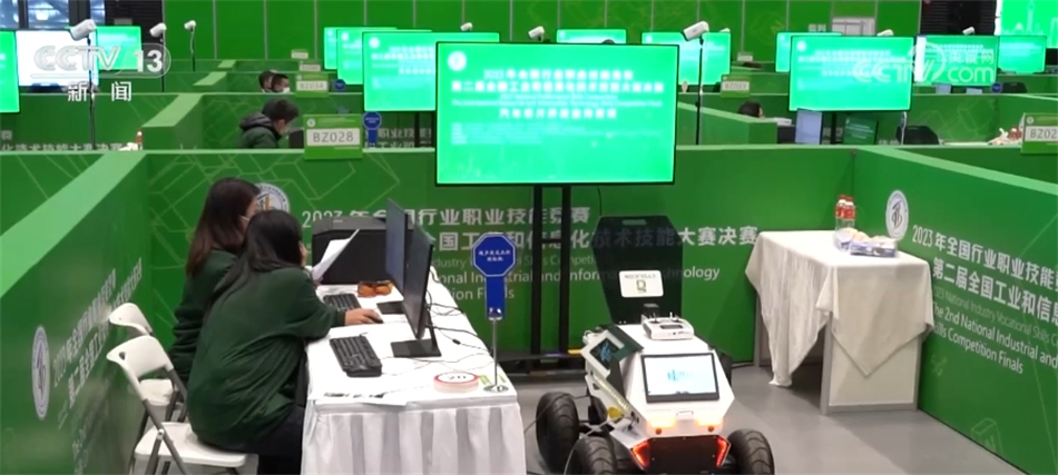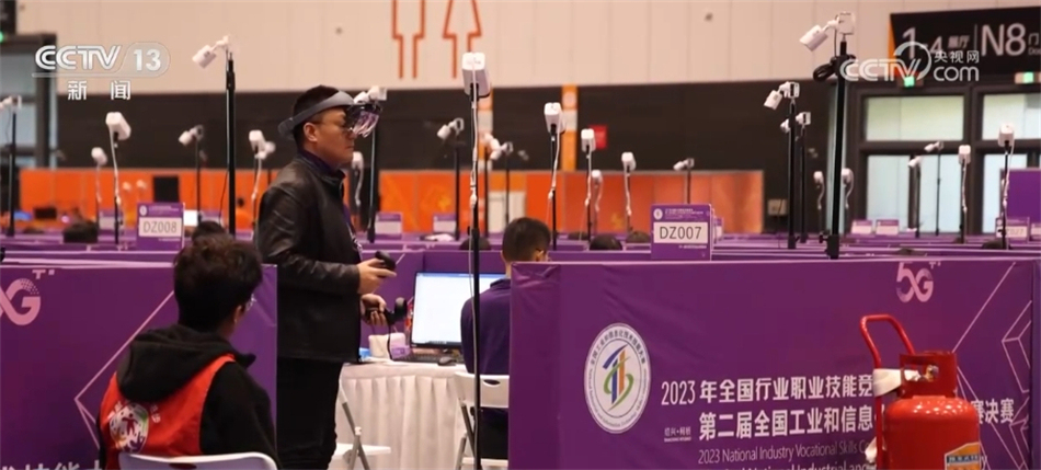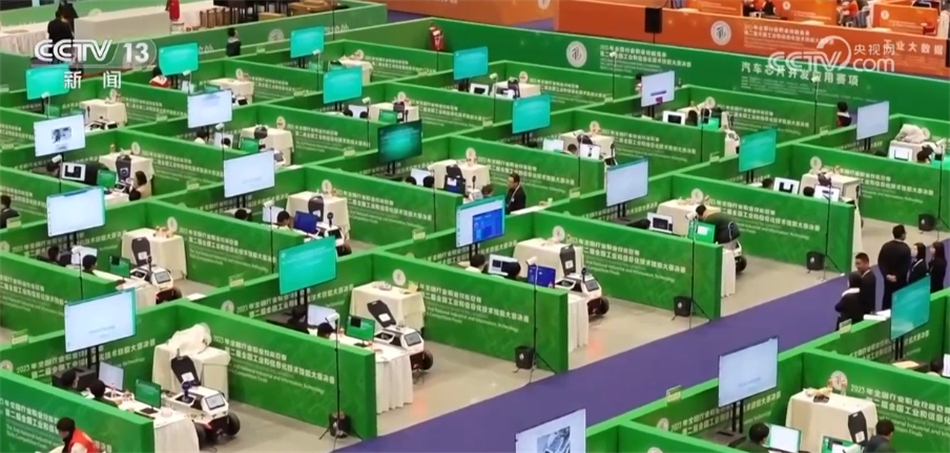 總臺(tái)央視記者 張叢婧:我身旁這一個(gè)個(gè)小隔間就是選手的比賽工位,可以看到有不同顏色,代表著四個(gè)賽項(xiàng),分別是工業(yè)互聯(lián)網(wǎng)安全、汽車芯片開(kāi)發(fā)應(yīng)用、工業(yè)大數(shù)據(jù)算法、5G+虛擬現(xiàn)實(shí)開(kāi)發(fā)應(yīng)用。除了工業(yè)大數(shù)據(jù)算法這一項(xiàng),其他三個(gè)賽項(xiàng)都是今年新設(shè)立的。