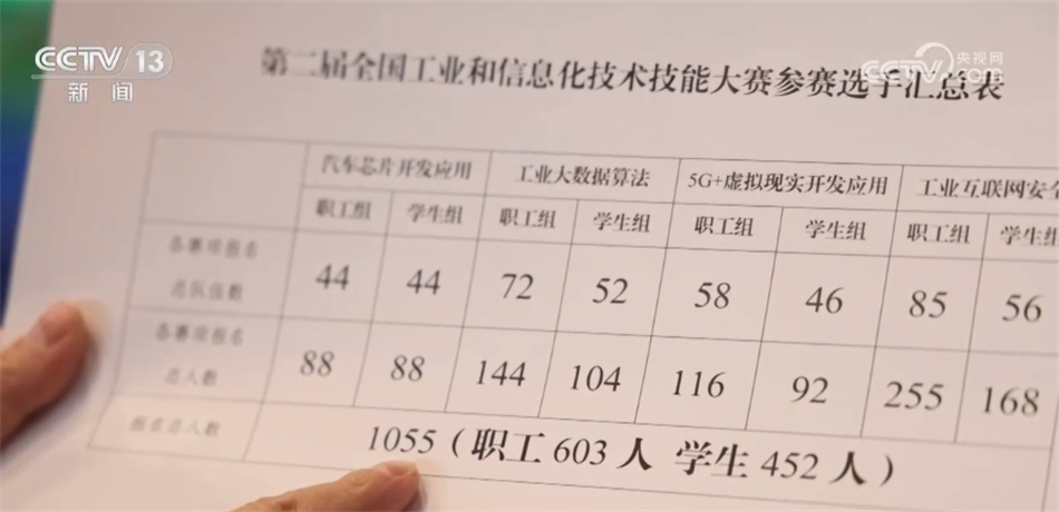 總臺(tái)央視記者 張叢婧:這是決賽的參賽表,可以看到,這次的選手有1000多名。我發(fā)現(xiàn),選手里將近一半都是學(xué)生,他們大部分來(lái)自職業(yè)院校。主辦方告訴我,和去年相比,今年學(xué)生的比例提高了30%多。