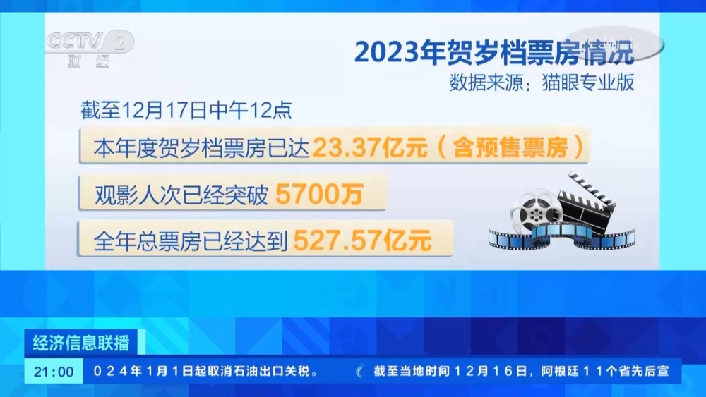 某電影數(shù)據(jù)平臺顯示,截至12月17日中午12點,本年度賀歲檔票房已達23.37億元(含預售票房),觀影人次已經突破5700萬,全年總票房已經達到527.57億元。