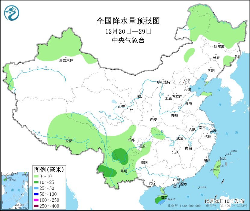 未來(lái)10天(12月20-29日),全國(guó)大部地區(qū)降水稀少,新疆北部、東北地區(qū)北部及西南地區(qū)東部等地累計(jì)降水量有2~15毫米。