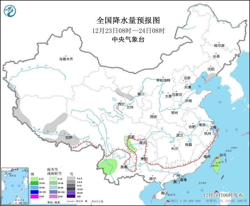 12月23日08時至24日08時,遼東半島、西藏南部和西部、甘肅河西等地部分地區(qū)有小雪或雨夾雪。四川盆地西南部、云南西部、臺灣島等地部分地區(qū)有小雨。青海東部、浙江東部等地部分地區(qū)有4~6級風(fēng)(見圖5)。
