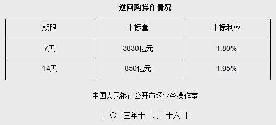 中新網(wǎng)12月26日電 據(jù)央行網(wǎng)站消息,為維護(hù)年末流動性合理充裕,2023年12月26日人民銀行以利率招標(biāo)方式開展了4680億元7天期和14天期逆回購操作。具體情況如下: