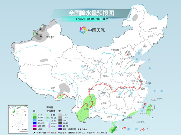 明天,內(nèi)蒙古東北部、新疆北部和南疆西部山區(qū)、西藏東部等地部分地區(qū)有小到中雪或雨夾雪,其中,新疆北疆北部和伊犁河谷等地部分地區(qū)有大雪。云南中部、廣東東南部沿海、海南島、臺(tái)灣島等地部分地區(qū)有小到中雨。