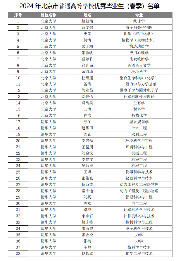 2024年北京市普通高等學(xué)校優(yōu)秀畢業(yè)生(春季)名單公布