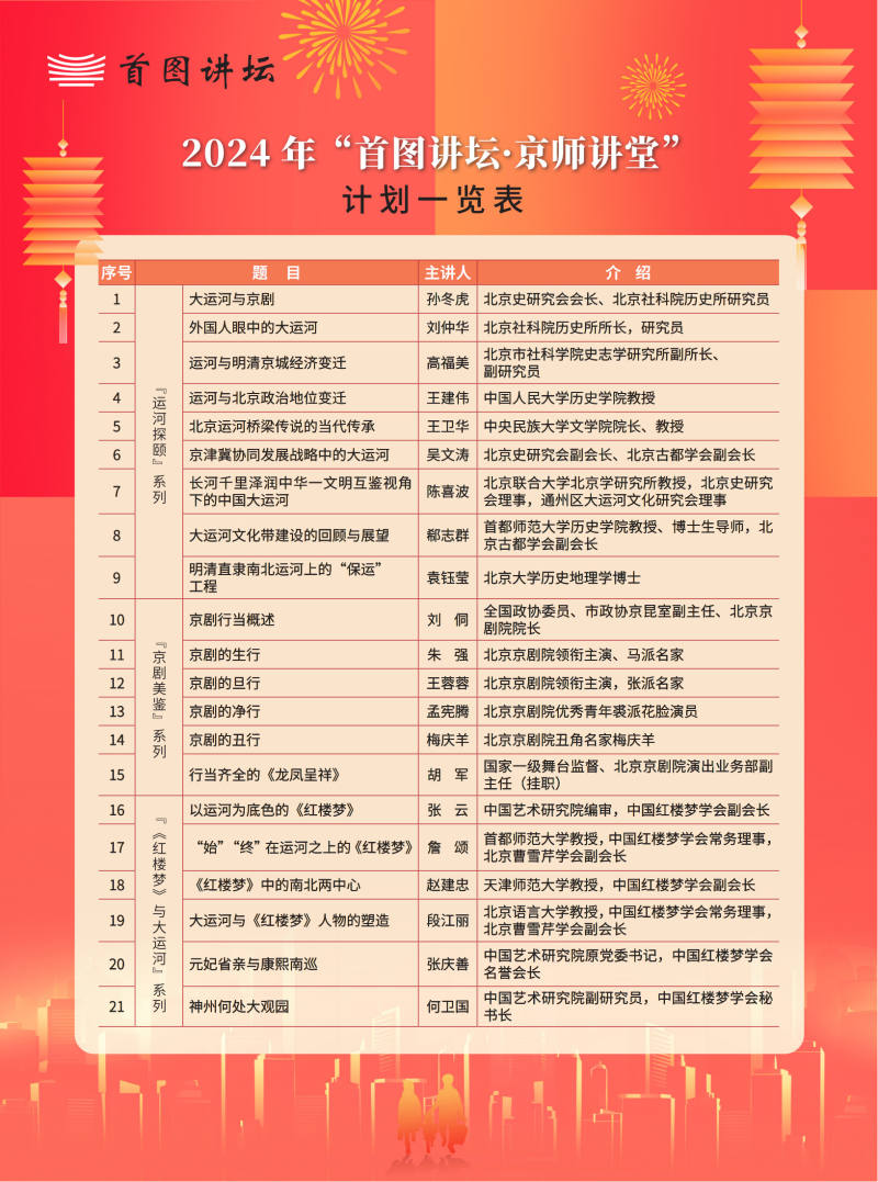 北京史研究會會長孫冬虎發(fā)布“京師講堂”2024年度主題講座計劃。全年近50場講座,包括北京胡同四合院、三山五園、明清北京商業(yè)、龍年說龍等歷史文化與社會生活主題,還有四項專題系列講座——“運(yùn)河探頤”系列將以大運(yùn)河的歷史變遷與運(yùn)河文化的挖掘、研究、傳承為焦點,展示北京城市發(fā)展與大運(yùn)河的密切關(guān)系;“京劇美鑒”系列致力于讓聽眾體味京劇國粹的獨特風(fēng)韻與文化價值;“《紅樓夢》與大運(yùn)河”系列將挖掘《紅樓夢》與世界文化遺產(chǎn)大運(yùn)河之間的密切關(guān)聯(lián);“清朝宮廷”系列將還原清代宮廷生活的真實場景,提升聽眾關(guān)于清代歷史與文化的準(zhǔn)確認(rèn)知。
