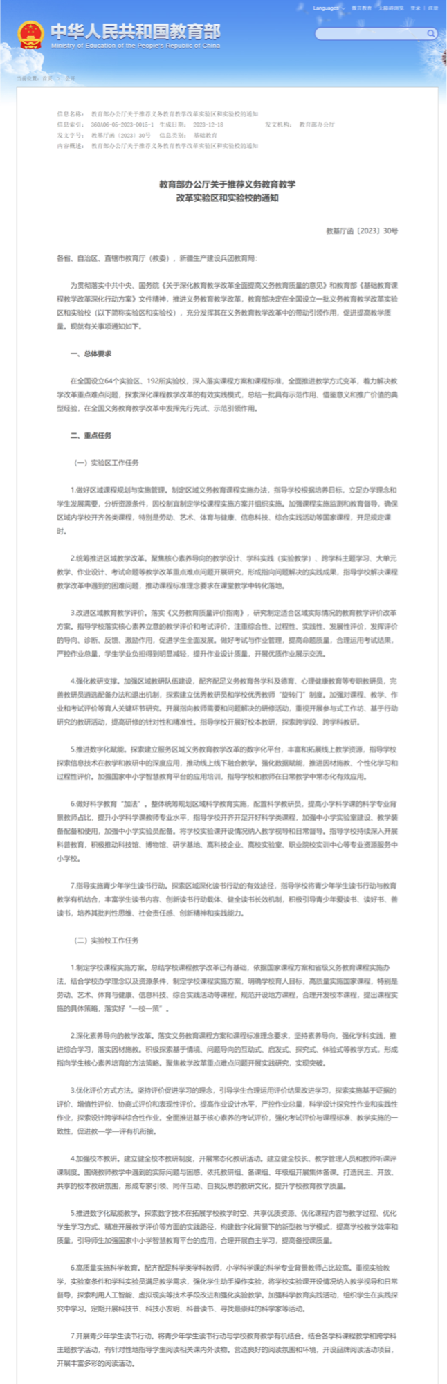 央廣網(wǎng)北京1月8日消息(記者 吳佳怡)近日,教育部辦公廳印發(fā)關于推薦義務教育教學改革實驗區(qū)和實驗校的通知,決定在全國設立一批義務教育教學改革實驗區(qū)和實驗校,并公示了義務教育教學改革實驗區(qū)和實驗校名單。