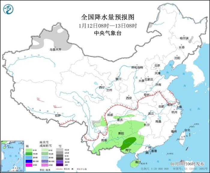 1月12日08時至13日08時,新疆北疆北部、川西高原南部等地部分地區(qū)有小雪或雨夾雪。四川盆地南部、湖南西部、貴州、云南東部和南部、廣西、海南島等地部分地區(qū)有小到中雨。西藏中部部分地區(qū)有5~6級風;南海東部和西南部等海域有6~7級風、陣風8級。
