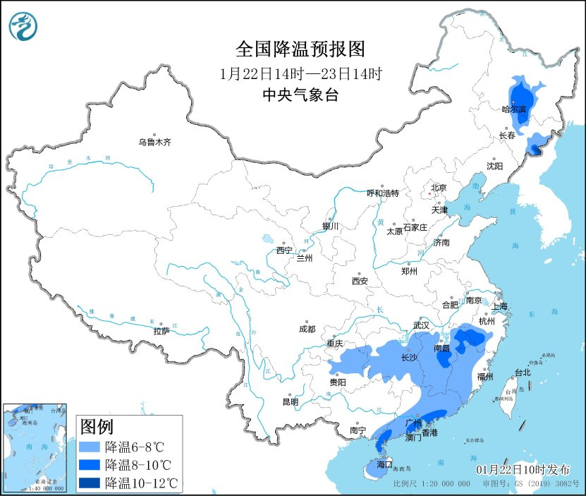 受寒潮影響,預(yù)計(jì),1月22日14時(shí)至1月23日14時(shí),黑龍江中部、吉林中東部、貴州東部、湖南中南部、江西、浙江西部、福建中西部、廣東東部和南部等地將降溫6~8℃,局地降溫超過9~10℃。23日至24日,最低氣溫0℃線將南壓到廣西北部和廣東北部一帶,江南、華南北部、貴州等地的最低氣溫可達(dá)-8~-1℃,華南中南部可達(dá)0~8℃。