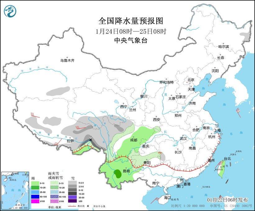 1月22日08時(shí)至23日08時(shí),黑龍江東部和西北部、吉林東部、新疆中部、甘肅河西、川西高原西南部、四川盆地南部、陜西南部、重慶東部、云南東部、貴州、湖北西部、湖南南部、江西、安徽南部、浙江中南部、福建北部、廣東北部、廣西北部等地部分地區(qū)有小到中雪或雨夾雪,其中,湖南南部、江西中南部、浙江西南部、福建西北部、廣西東北部、廣東北部等地部分地區(qū)有大到暴雪(10~15毫米)。四川盆地中部、云南中部、廣西中南部、廣東中南部、福建中南部、海南島、臺(tái)灣島等地部分地區(qū)有小到中雨。遼東半島、河北北部、浙江北部、廣西東南部沿海等地部分地區(qū)有5~6級(jí)風(fēng),渤海、渤海海峽、黃海、東海、臺(tái)灣海峽、臺(tái)灣以東洋面、巴士海峽、南海大部、北部灣等海域有6~8級(jí)風(fēng),陣風(fēng)9~10級(jí)(見(jiàn)圖3)。