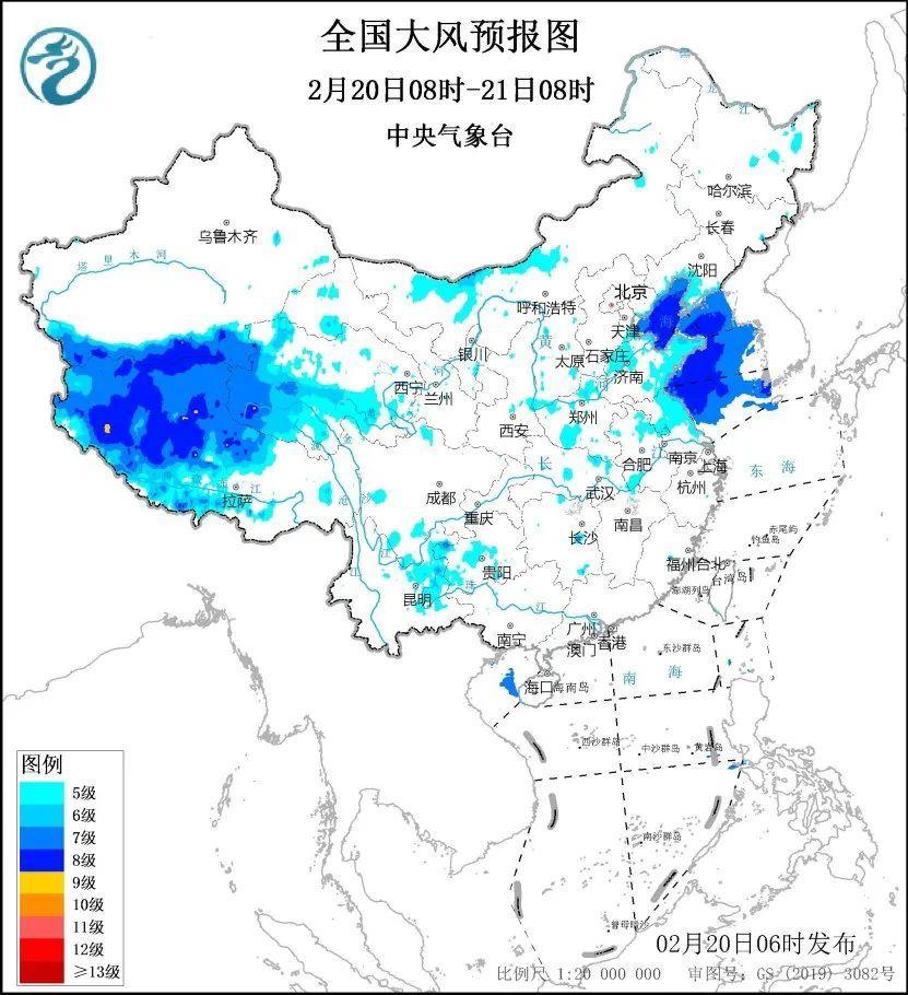 2月21日8時至22日8時,西藏中西部、青海中南部、華北東部、黃淮西部和東部、江淮西部等地的部分地區(qū)有5至6級風(fēng),陣風(fēng)7至8級。渤海、渤海海峽、黃海大部海域?qū)⒂?至8級,陣風(fēng)9至10級的大風(fēng)。