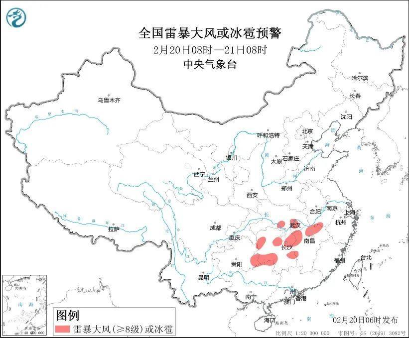 預(yù)計2月20日8時至21日8時,安徽西南部、湖北東部和南部、湖南中北部和西南部、江西中北部、貴州東南部、廣西東北部等地的局地將有8至10級雷暴大風(fēng)或冰雹天氣;安徽中南部、江蘇西南部、湖北東部、湖南南部和西部、江西北部、廣西東北部等地的部分地區(qū)將有短時強(qiáng)降水天氣,最大小時雨量20至30毫米,局地可達(dá)35毫米以上。