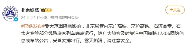 中新網(wǎng)2月21日電 據(jù)中國鐵路北京局集團有限公司官方微博消息,受大范圍降雪影響,北京局管內(nèi)京廣高鐵、京滬高鐵、石濟客專、石太客專等部分線路旅客列車晚點運行。
