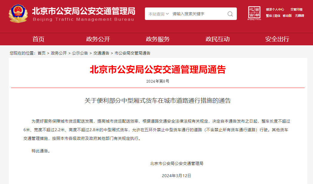 為更好服務保障城市貨運配送發(fā)展,提高城市貨運配送效率,根據(jù)道路交通安全法律法規(guī)有關規(guī)定,決定自本通告發(fā)布之日起,整車長度不超過6米、寬度不超過2.2米、高度不超過2.8米的中型廂式貨車,允許在五環(huán)外禁止中型貨車通行的道路(不含禁止所有貨車通行道路)行駛。其他貨車交通管理措施,按照本市各級政府及政府其他部門有關規(guī)定執(zhí)行。