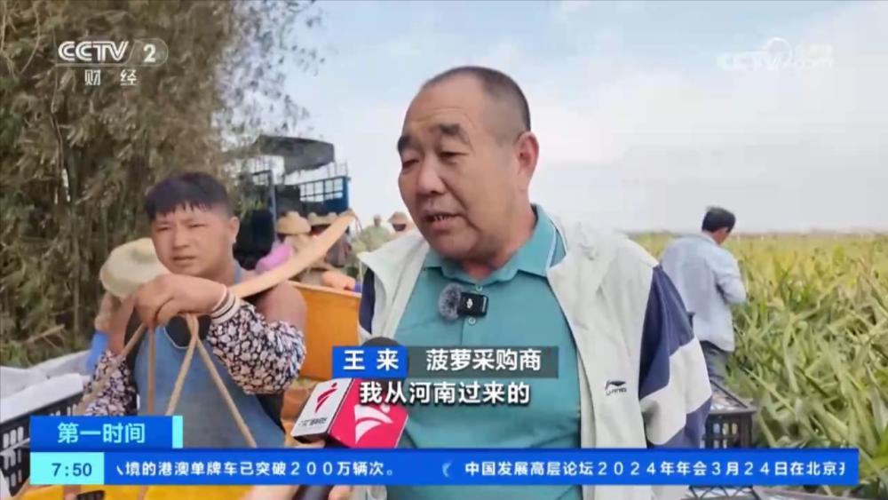 菠蘿采購(gòu)商 王來(lái):我從河南過(guò)來(lái)的。這個(gè)季節(jié)每天發(fā)個(gè)幾十車是沒什么問題的,也就是幾十萬(wàn)斤,基本上每天都發(fā)。