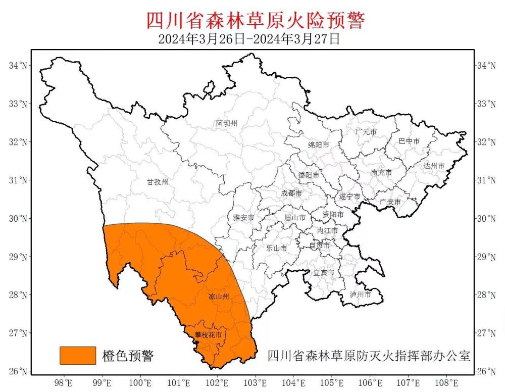 經(jīng)四川省森防指辦公室與四川省林草局、四川氣象局及相關(guān)地區(qū)會商,預(yù)計3月26日至27日攀枝花市,甘孜州東部局地和南部,涼山州西部、中部和南部(涉及21個縣級行政單位)森林草原火險等級將維持在高度危險級別。經(jīng)研究,延長省森防指辦公室3月21日發(fā)布的高森林草原火險橙色預(yù)警至3月27日,預(yù)警范圍不變。