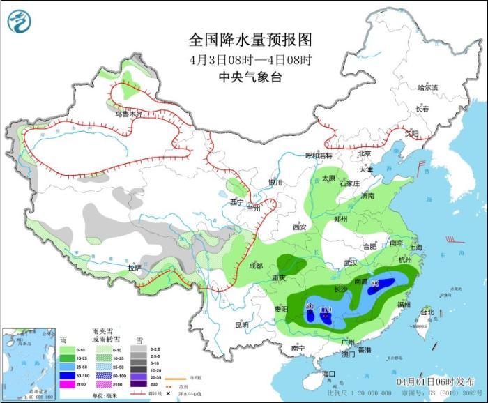 4月3日08時(shí)至4日08時(shí),新疆北疆高海拔地區(qū)和南疆西部山區(qū)、西藏北部、東部和西南部、青海南部、川西高原北部等地部分地區(qū)有小到中雪或雨夾雪。四川東部、重慶中部、貴州東部、浙江中南部、江西大部、湖南中南部、廣西北部、廣東北部等地部分地區(qū)有中到大雨,其中,湖南南部、江西中北部、福建西北部、廣西東北部等地部分地區(qū)有暴雨,局地大暴雨(100~110毫米)。