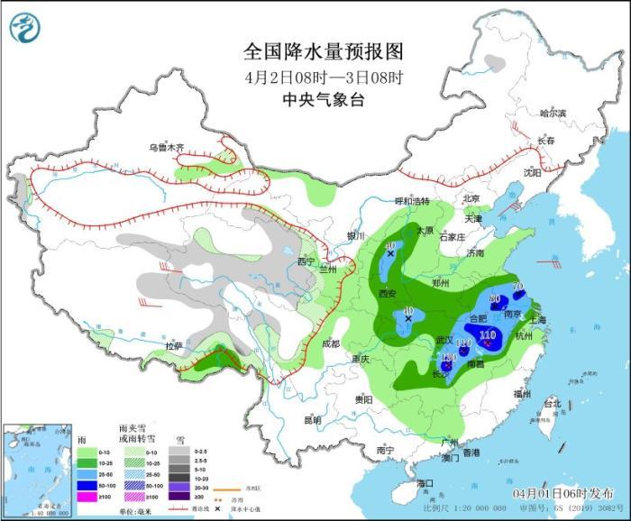 4月1日08時(shí)至2日08時(shí),新疆沿天山地區(qū)和南疆盆地、西藏北部和東部、青海大部、川西高原北部等地部分地區(qū)有小到中雪或雨夾雪,其中,新疆沿天山地區(qū)和南疆盆地、青海東北部等地部分地區(qū)有大到暴雪,新疆沿天山地區(qū)局地大暴雪(20~21毫米)。陜西東南部、河南中南部、安徽大部、江蘇中西部、四川東部、重慶大部、貴州東北部、湖北、湖南中北部、江西大部、浙江中西部、福建中西部等地部分地區(qū)有中到大雨,其中,河南南部、安徽中南部、湖北東部和南部、湖南北部和西部、江西北部和東南部、福建西部、重慶東南部等地部分地區(qū)有暴雨,局地大暴雨(100~120毫米)。內(nèi)蒙古西北部、新疆東部、青海西部、甘肅河西等地部分地區(qū)有4~6級(jí)風(fēng),其中,新疆東部部分地區(qū)有7~8級(jí)風(fēng),山口風(fēng)力可達(dá)11級(jí)以上。