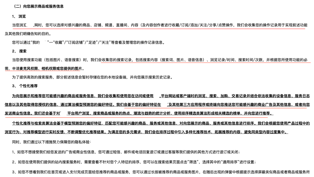某購物平臺基本功能隱私政策顯示,搜集瀏覽、搜索等相關(guān)信息(央廣網(wǎng)發(fā) 某購物網(wǎng)站截圖)