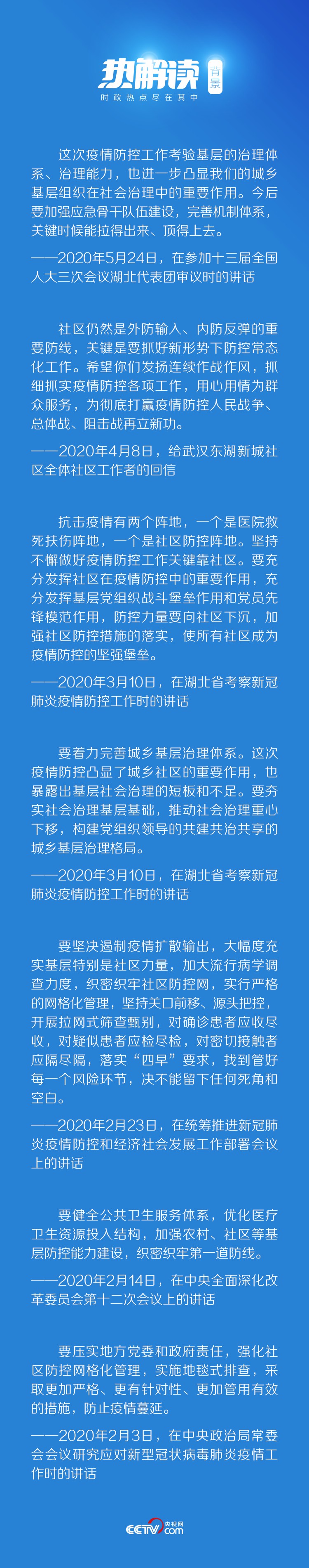 習近平在后來的講話中強調,要“堅持常態(tài)化精準防控和局部應急處置有機結合,加強社區(qū)精準防控”,“健全疾控機構與城鄉(xiāng)社區(qū)聯(lián)動工作機制,加強鄉(xiāng)鎮(zhèn)衛(wèi)生院和社區(qū)衛(wèi)生服務中心疾病預防控制職責,夯實聯(lián)防聯(lián)控的基層基礎”。
