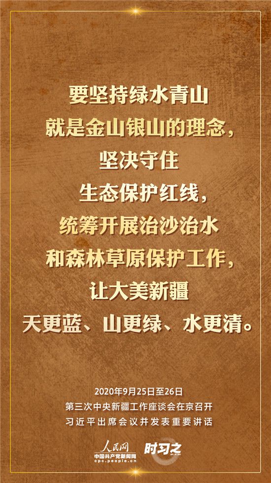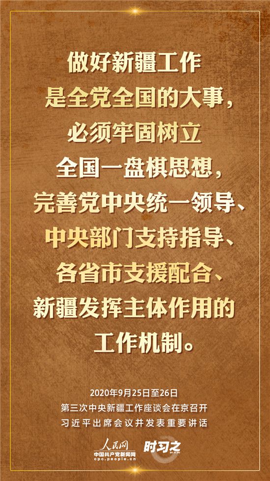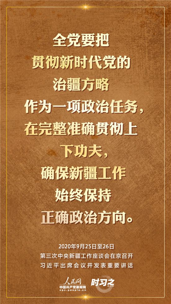 9月25日至26日,第三次中央新疆工作座談會在北京召開。習近平總書記出席會議并發(fā)表重要講話。習近平全面總結了第二次中央新疆工作座談會以來新疆工作取得的重大成效,深入分析了當前新疆工作面臨的形勢,闡釋了新時代黨的治疆方略,明確了當前和今后一個時期新疆工作的指導思想、目標任務、方針政策、戰(zhàn)略舉措,全面部署了推動新疆社會穩(wěn)定和長治久安的重點工作。人民網·中國共產黨新聞網“時習之”欄目帶您聆聽總書記那些直抵人心的講話金句。