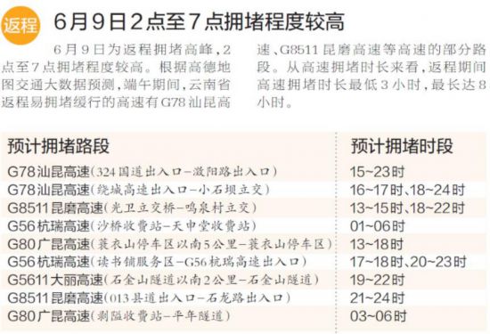 從收費站擁堵情況看,6月7日-9日,預計較為擁堵的收費站主要是勝境關收費站、小喜村收費站、河口收費站、昆明收費站。其中勝境關收費站擁堵時長達2.7小時,車速為14公里/小時。