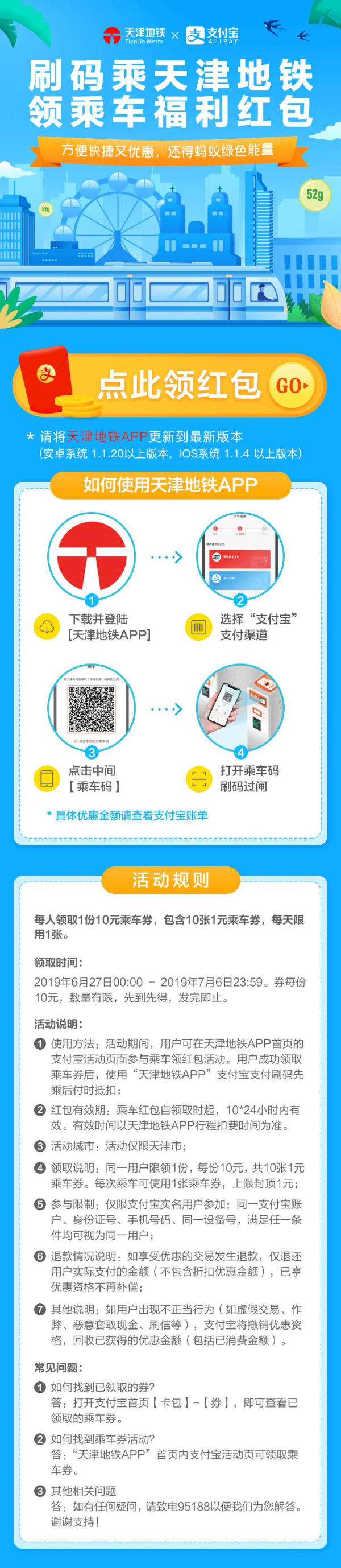 為回饋廣大市民對天津地鐵的支持,天津軌道交通運營集團有限公司與支付寶(中國)網(wǎng)絡技術(shù)有限公司聯(lián)合開展出行優(yōu)惠活動,自2019年6月27日至2019年7月6日期間,乘客可在天津地鐵APP或支付寶APP領取支付寶紅包。