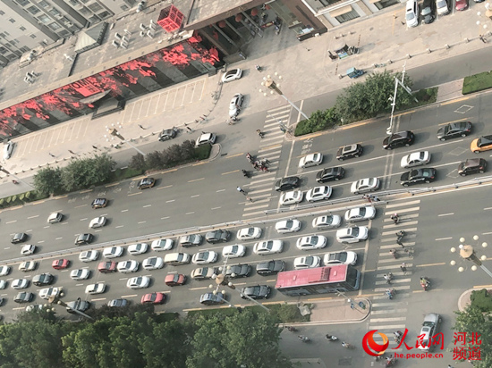 6月12日上午8時(shí)許,正值上班高峰期,石家莊市區(qū)主干道裕華路上,人多車(chē)多。裕華路與體育大街交口往東,北側(cè)是劍橋春雨小區(qū),南側(cè)是方北小區(qū),兩個(gè)小區(qū)門(mén)口正對(duì)裕華路的半幅機(jī)動(dòng)車(chē)道上分別畫(huà)著斑馬線(xiàn)。因?yàn)楦浇袑W(xué)校,南北兩側(cè)陸陸續(xù)續(xù)有送孩子的家長(zhǎng)或騎車(chē)人從斑馬線(xiàn)通過(guò)裕華路。每當(dāng)有人通過(guò)斑馬線(xiàn)時(shí),裕華路上的汽車(chē)都會(huì)停下來(lái)等候。由于行人三五成群,不斷通過(guò),路上的汽車(chē)不得不繼續(xù)等候,以至于排起了長(zhǎng)龍。