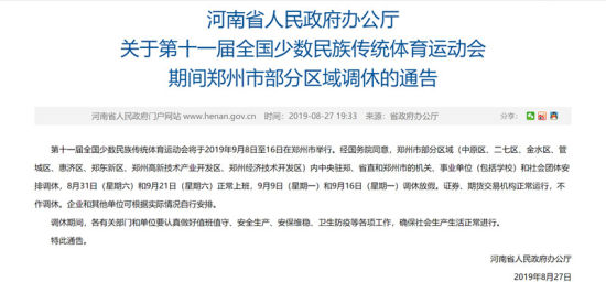 第十一屆全國少數(shù)民族傳統(tǒng)體育運動會將于2019年9月8日至16日在鄭州市舉行。經(jīng)國務(wù)院同意,鄭州市部分區(qū)域(中原區(qū)、二七區(qū)、金水區(qū)、管城區(qū)、惠濟區(qū)、鄭東新區(qū)、鄭州高新技術(shù)產(chǎn)業(yè)開發(fā)區(qū)、鄭州經(jīng)濟技術(shù)開發(fā)區(qū))內(nèi)中央駐鄭、省直和鄭州市的機關(guān)、事業(yè)單位(包括學校)和社會團體安排調(diào)休,8月31日(星期六)和9月21日(星期六)正常上班,9月9日(星期一)和9月16日(星期一)調(diào)休放假。