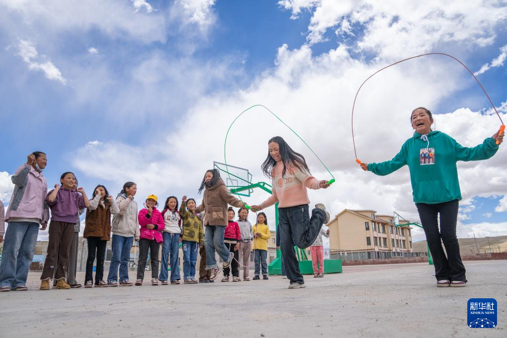 班戈縣中石化小學學生尼瑪措姆(右二)和同學們在操場上跳繩(6月22日攝)。