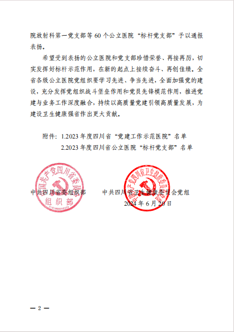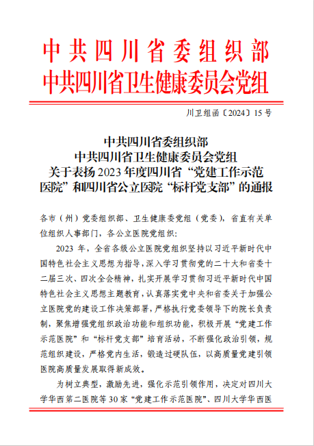 近日,中共四川省委組織部、中共四川省衛(wèi)生健康委員會黨組發(fā)文通報表揚了2023年度四川省“黨建工作示范醫(yī)院”和公立醫(yī)院“標桿黨支部”(川衛(wèi)組函〔2024〕15號),安岳縣人民醫(yī)院榮獲2023年度四川省“黨建工作示范醫(yī)院”!
