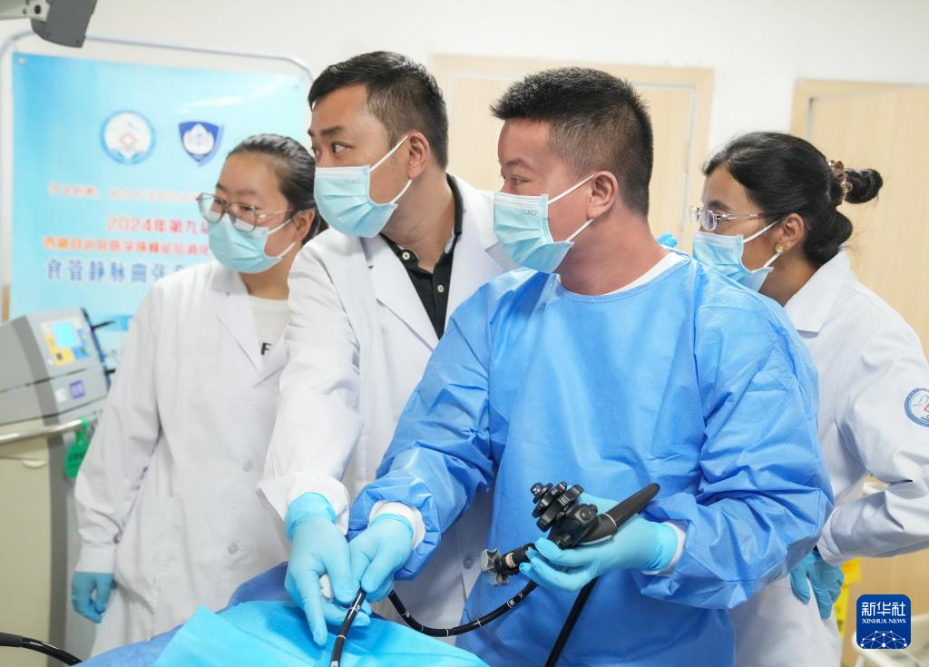 在日喀則市人民醫(yī)院,段穎騫(左一)在進(jìn)行內(nèi)鏡手術(shù)(7月8日攝)。新華社記者 丁汀 攝