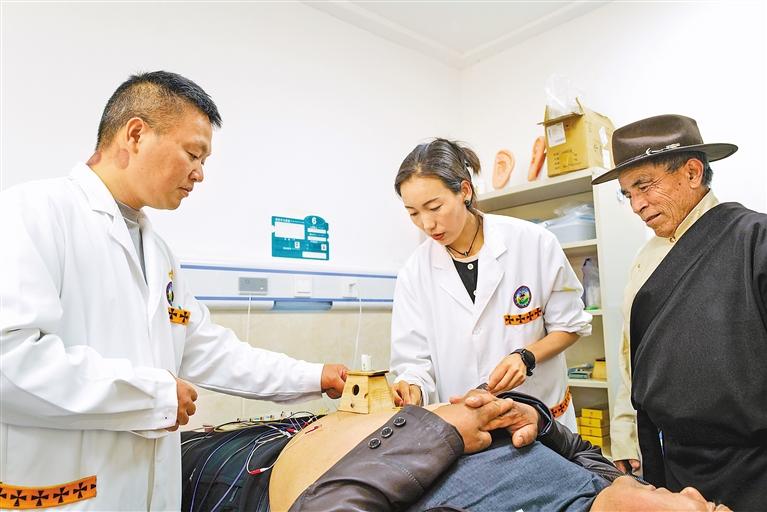 圖為在昌都市察雅縣藏醫(yī)院,重慶市大足區(qū)人民醫(yī)院援藏醫(yī)生(左)與藏醫(yī)院醫(yī)生結(jié)合中醫(yī)與藏醫(yī)療法,為患者進(jìn)行診治。 記者 丹增群培 攝