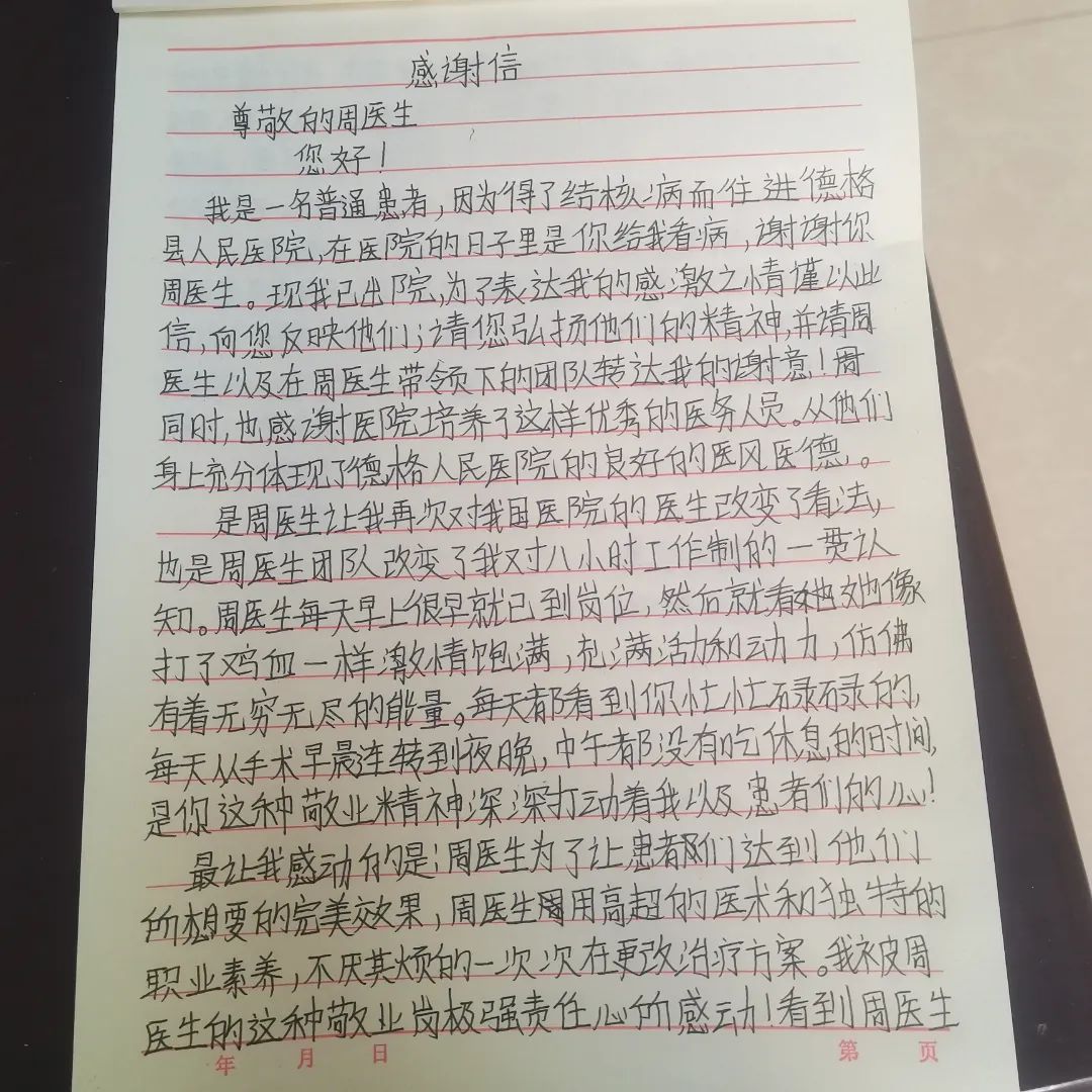 7月1日,一名在德格縣人民醫(yī)院就診的結(jié)核患者向成都市公共衛(wèi)生臨床醫(yī)療中心援藏醫(yī)師周瑜送來了一封感謝信,在信中,患者對周瑜醫(yī)生及其團(tuán)隊在住院期間給予她的積極診治和熱情關(guān)懷表示感謝,并對科室團(tuán)隊的診療技術(shù)和治療的預(yù)后效果都作出了非常高的評價。