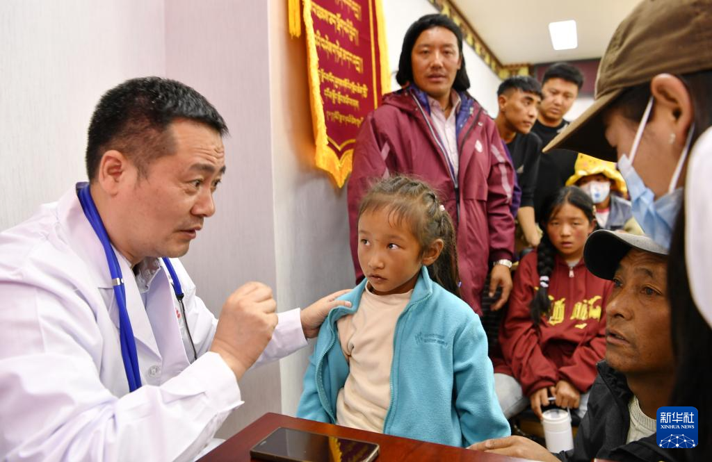 7月23日,南京醫(yī)科大學(xué)附屬兒童醫(yī)院心胸外科主任戚繼榮(左)在墨竹工卡縣為兒童體檢。 新華社記者 張汝鋒 攝