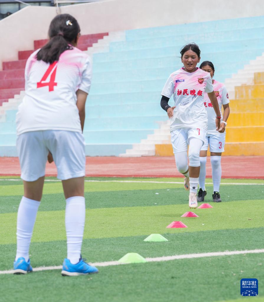 在西藏日喀則市上海實(shí)驗(yàn)學(xué)校,“珠峰雪鷹”女子足球隊(duì)隊(duì)員們?cè)诓賵?chǎng)上訓(xùn)練(9月3日攝)。