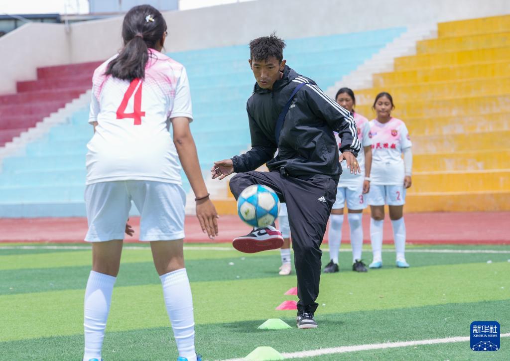 西藏日喀則市上海實(shí)驗(yàn)學(xué)?!爸榉逖棥迸幼闱蜿?duì)教練洛布桑在操場(chǎng)上指導(dǎo)球員訓(xùn)練(9月3日攝)。