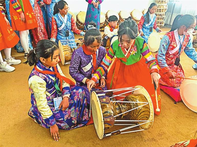 在“吉藏一家親”冬令營活動(dòng)中,日喀則學(xué)生在朝鮮族學(xué)生指導(dǎo)下學(xué)習(xí)打朝鮮族長鼓。