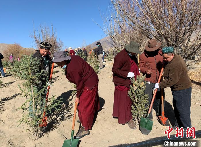 當(dāng)日植樹(shù)現(xiàn)場(chǎng),各界民眾揮鍬培土、扶直苗木,將一棵棵國(guó)槐、樟子松樹(shù)苗種植在雅魯藏布江畔。