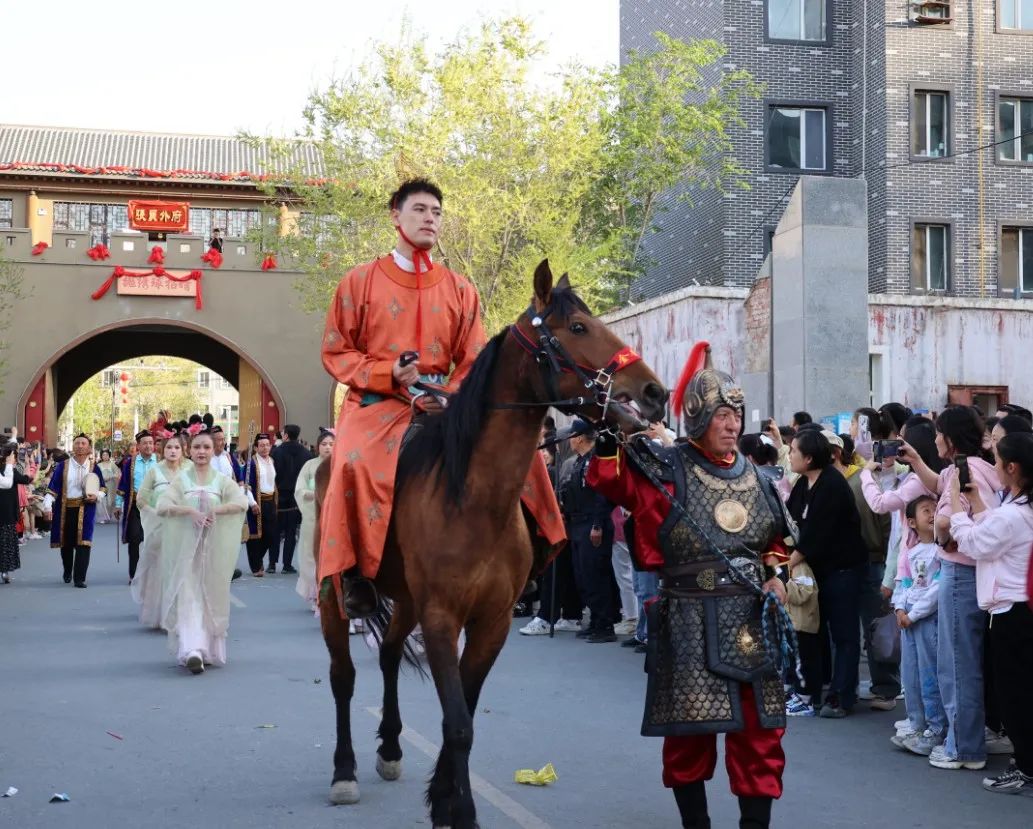 一隊身著鎧甲、手執(zhí)紅纓槍的威武“瀚海軍”兵士,步伐整齊、沿街巡邏,路上行人紛紛拿出手機拍照。這是在吉木薩爾縣街頭常見的北庭都護府將士“巡城護疆”的精彩場景。