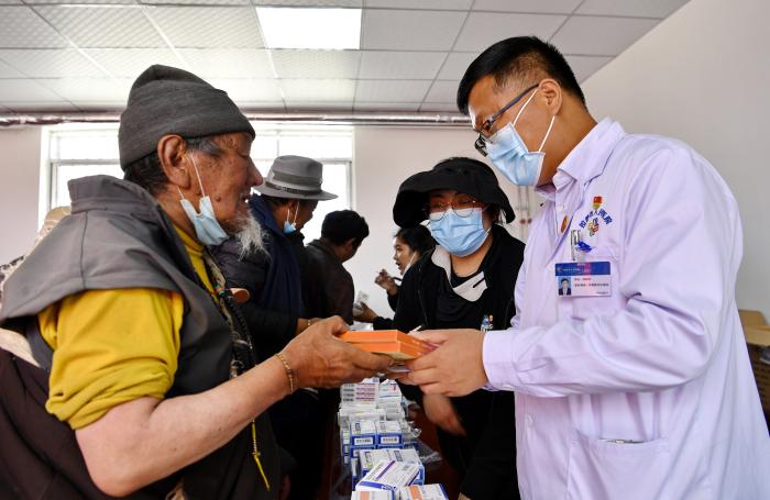 圖為2022年6月9日,時任拉薩市人民醫(yī)院院長、北京市第七批醫(yī)療人才“組團式”援藏醫(yī)療隊隊長孫樹學(前排右)在拉薩市當雄縣格達鄉(xiāng)為群眾義診發(fā)藥 受訪者供圖