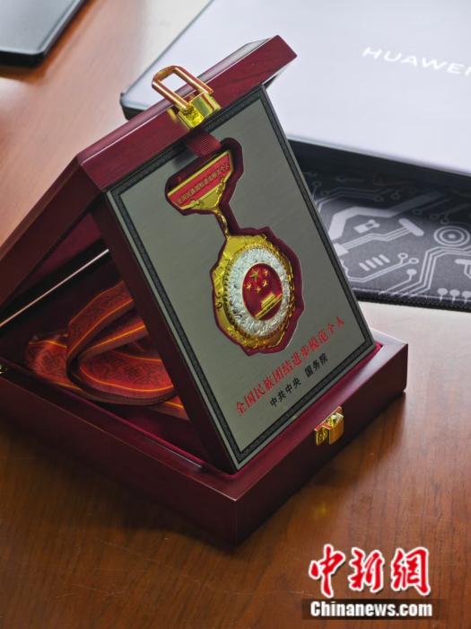 圖為孫樹學榮獲的全國民族團結進步模范個人獎章 中新網(wǎng) 薛凌橋 攝